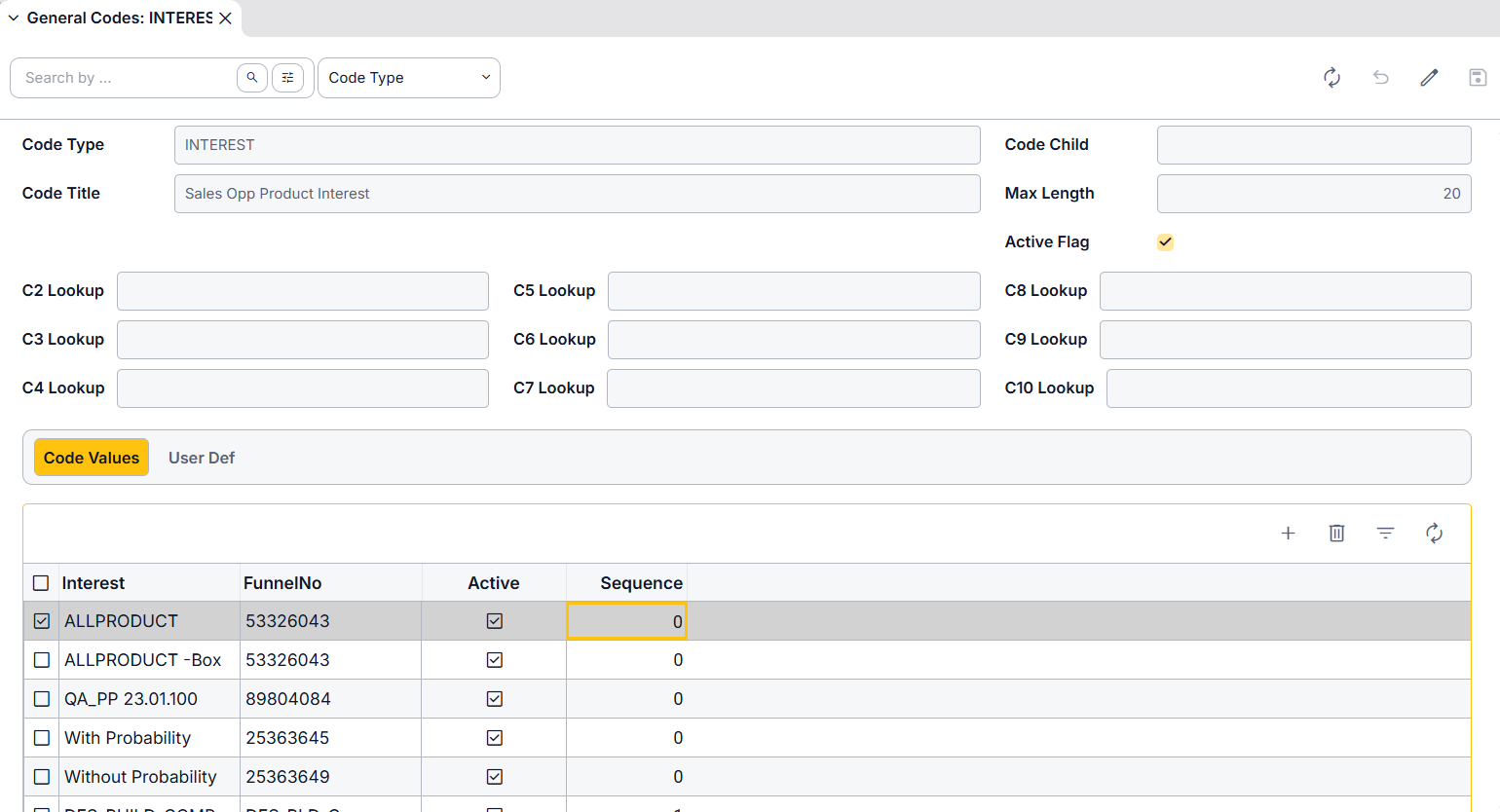 - Search for code “Interest” representing the “Sales Opp Product Interest”