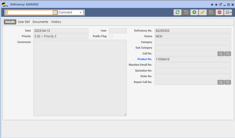 - On Helpdesk form, Product form or Product Detail form, click on the Deficiency tab