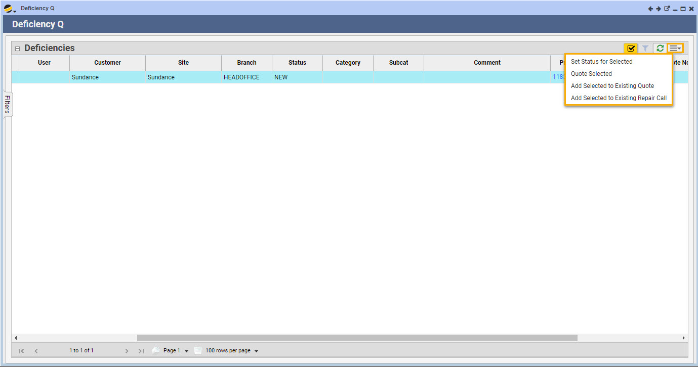 - Click on the grid extended menu and select “Quote Selected.” Note that deficiencies may be added to an existing quote or an existing repair call from the same menu